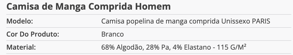 Tamanhos: S, M, L, XL, XXL